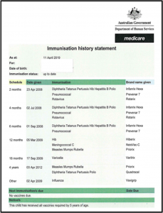 - ACIR Immunisation history statement, not more than two months old. Click HERE to view an example. Please see below for instructions on obtaining your child’s AIR statement.